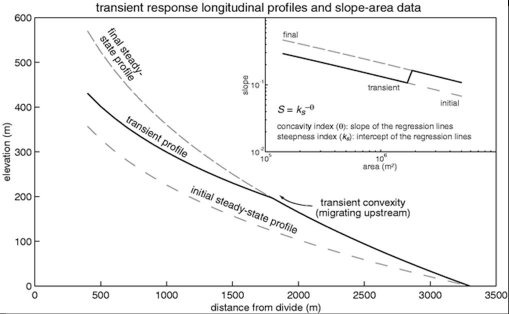 The sharp change in slope found in the middle of the transient profile is termed a knickpoint. Downstream of the knickpoint, the stream has or is responding to the uplift by incising to it’s new equilibrium profile. Upstream of this point, the stream has not yet begun to “feel” the effects of the uplift and therefore will maintain its previous profile until the knickpoint migrates upstream.