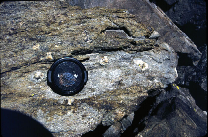 These rocks are considered to be glacial diamictites from the Early Proterozoic Libby Creek Group in the Snowy Mountains of the Southern Rocky Mountains. The white blobs are the clasts that fell into muddier sediment now turned into schist by metamorphism. These rocks were deposited at a time when the Earth's atmosphere was changing, with increases in oxygen and possibly a reduction in greenhouse gases like methane and carbon dioxide. Other localities of this age also suggest glaciation, indicating this might be a worldwide event.