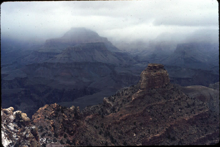Paleozoic rocks of the Grand Canyon from the South Kaibab Trail. The Cambrian Tapeats Sandstone, on the edge of the inner gorge at left, is overlain by the slope-forming Cambrian Bright Angel Shale, which is turn is overlain by (in order) the Cambrian Muav Limestone, the Mississippian Redwall Limestone, the Pennsylvanian and Permian Supai Group, and the Permian Coconino Sandstone. The Proterozoic Vishnu Schist is hiding in the inner gorge of the canyon. The bottom three units record the major transgression of the ocean over western North America; the top units were deposited when the Ancestral Rocky Mountains were formed. The canyon itself is Tertiary in age, though whether extremely young (post 10 Ma) or middle Tertiary is still disputed.