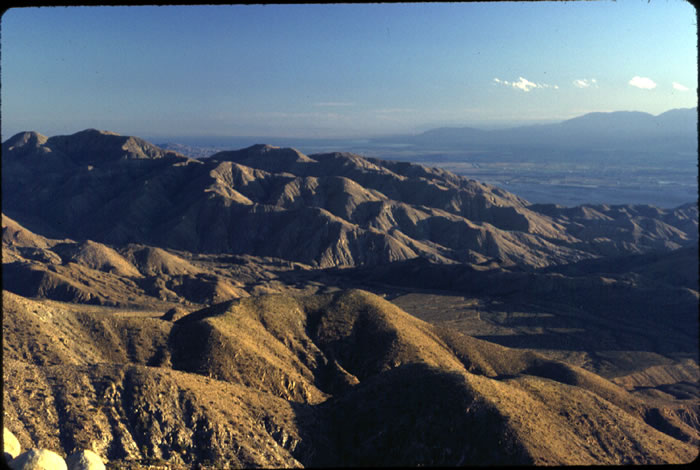 Salton Trough from the Little San Bernadino Mountains, Joshua Tree National Park. The Salton Trough is in some ways becoming the northernmost spreading center along the Gulf of California, helping to pull coastal California away from North America; in other ways, it is a large releasing bend along the San Andreas fault system as displacement steps right across the valley from the San Andreas Fault proper (at the near side of the Trough) to the Imperial Fault and San Jacinto Fault on the far side of the Trough. In this area, the Eastern California Shear Zone separates from the San Andreas Fault system and heads more northerly towards the east side of the Sierra Nevada. The San Andreas Fault itself lies between the Little San Bernadino Mtns. and the Salton Trough.