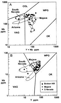 4. similar aged anorogenic plutons--1.1-1.2Ga diabase and basalts in Mojavia, 1.3-1.5 granites in Broken Hill