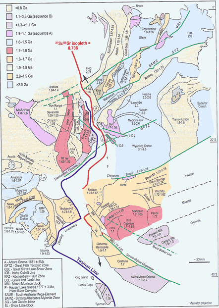 paleorift margins, sources for miogeooclinal sediments, and paleomagnetic evidence.