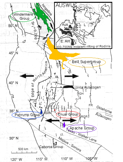 The Chuar group was deposited no earlier than 742 +/- 6 Ma (Karlstrom et al., 2000b) as well as associated rift sediments. The rift sediments of the Windermere supergroup was also at this time--after 780 Ma (Ross, 1991). The provinence of the Windermere is argued to be from the North American craton (Ross, 1991). So either the source direction was very different from the other groups (discussed next) or Laurentia had already rifted from whichever craton was associated with it. Because the Chuar group is speculated to have been derived from an Australian source (Karlstrom et al., 2000b), it is more likely that the Windermere had a different source direction.