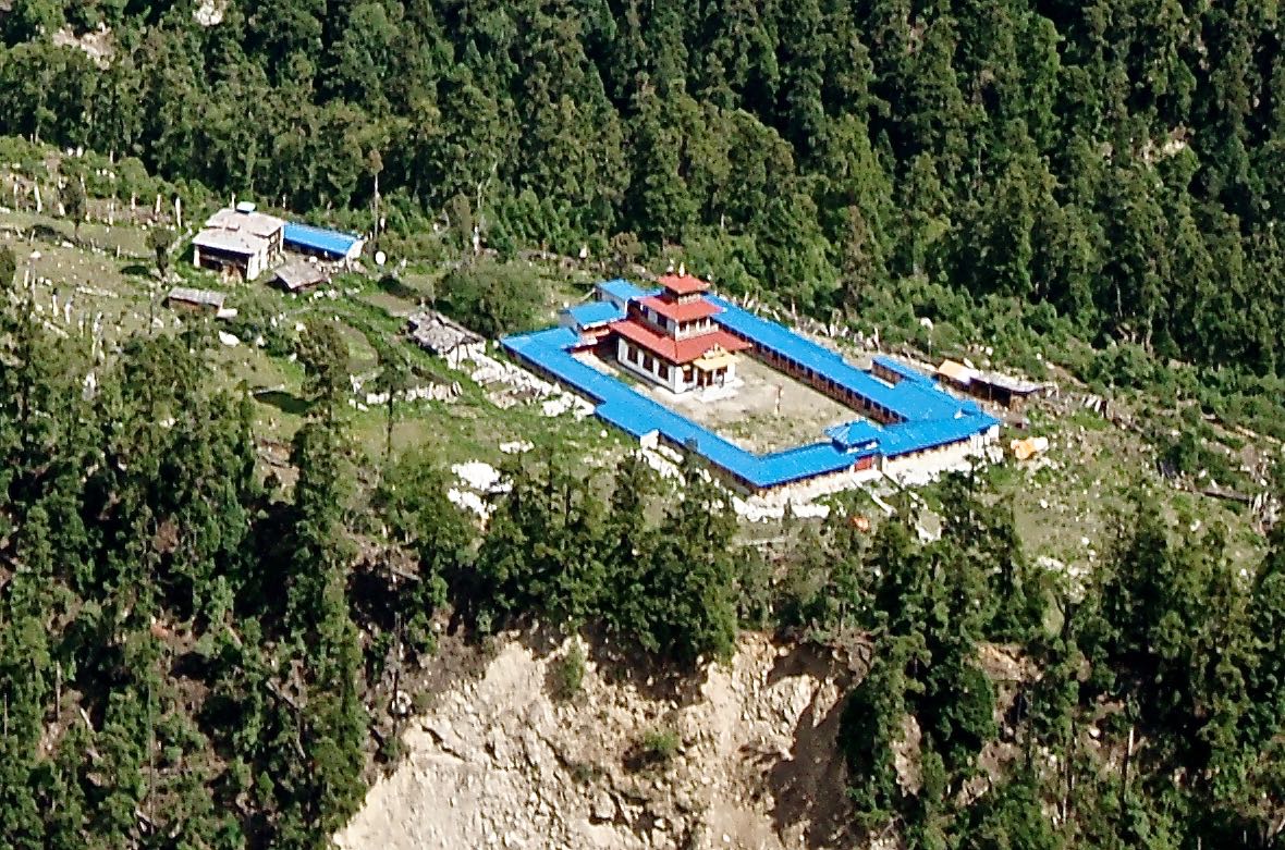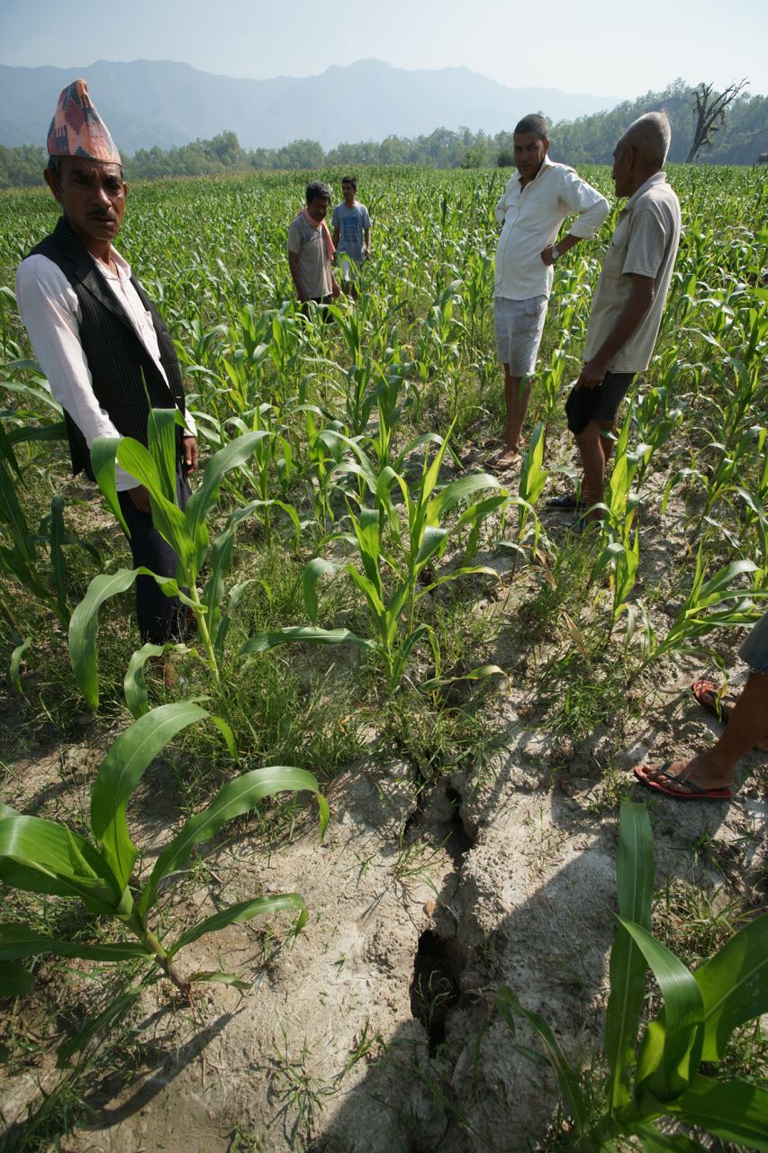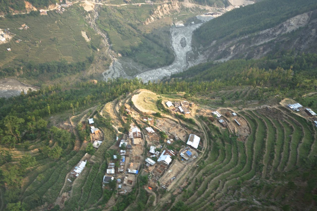 pillars in base of RCC; fissure in hillside; G3 damage to RCC building; total masonry collapse. Barpak reconstruction 5 weeks after mainshock. |