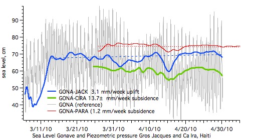 Sea level near Haiti is at its lowest since 1994 as a result of oceanic gyres in the Caribbean (TOPEX). The experimental measurements described here are designed to measure changes in relative elevation between reference gage GONA and four coastal sites near the epicenter of the Haiti earthquake. Results to May 2010 show adjustments of a few mm each week. The data are provided to the Ministry of Mines and Energy, Haiti, with whom we are collaborating.