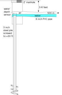 A sealed 6" PVC pipe is buried at a depth 3-6 feet and half-filled with water to emulate an underground lake. Tilts of the ground are measured relative to this horizontal watersurface. To reduce sensitivity to ground motions caused by rainfall and snow loads the sensors are attached to buried helical piles driven like corkscrews 30 feet underground. The battery-powered water level sensors are accessed via a 2 foot manhole cover. Once installed, the tiltmeter requires little maintenance. Data are transmitted to a nearby computer via radio links every few seconds, and the computer forwards the data to analysis centers in Ellensburg WA and Boulder, Colorado.