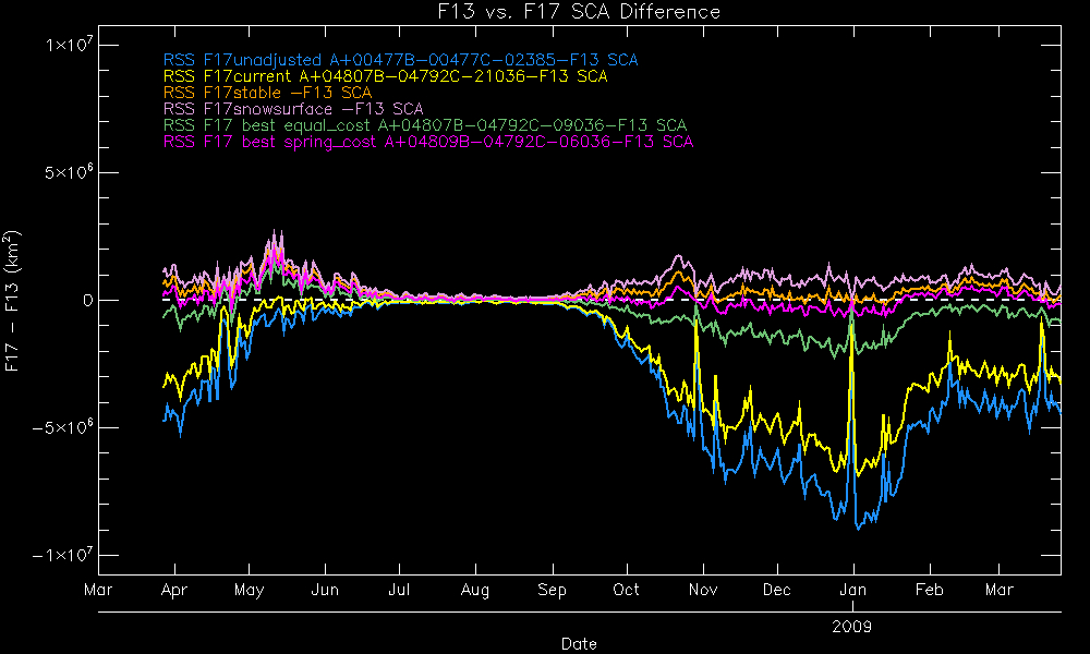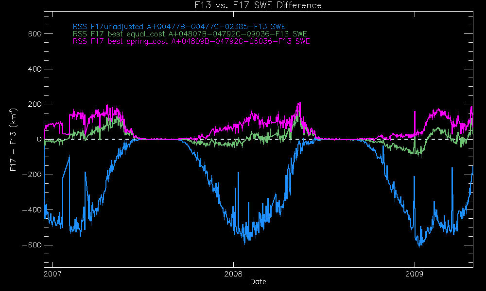 In the spring of 2009, we were still using F13 data for daily NISE and CRREL SWE maps processing, but we were aware of problems with F13 that indicated its impending demise. At that time, we started comparing F13 data to the F17 data we had received, which was only available for data beginning in March 2008, nearly 1.25 years after the F17 launch date. (The earlier data had not been made publicly available by the Air Force.)