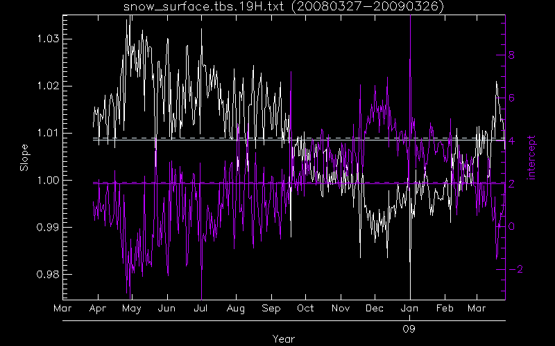 Figure 3. Time series of daily slope/intercepts for F13 vs. F17, descending passes, daily 19H and 37H TB linear regressions for potentially snow-covered surfaces. Used to derive F17snowsurface TB regressions.