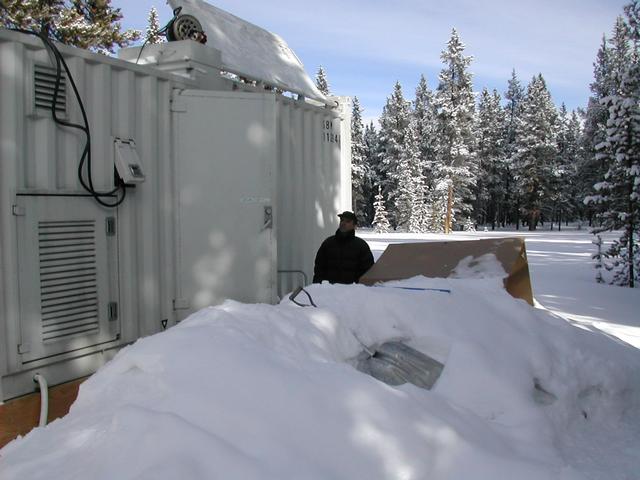 Ken, outside the container, while the roof is opening so we can lift the radiometer up. Notice the fresh snow that's fallen (about 6 inches (15 cm)) since last week.