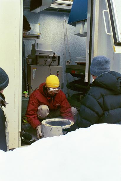 Fujii, lifting the calibration target, filled with boiling nitrogen, up to the instrument platform.