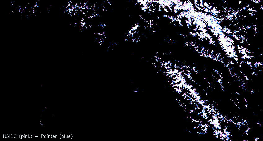 | Difference: NSIDC - UCSB binary, white=agree, pink=NSIDC only, blue=UCSB only |