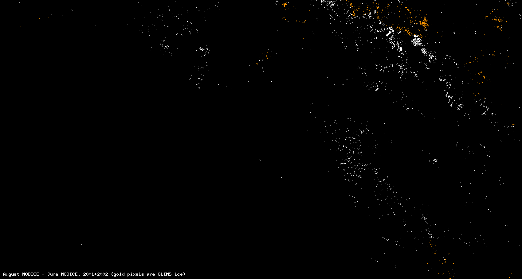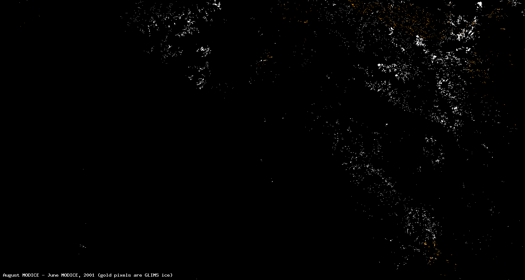 But the real question: how much of this "extra" ice is real? So I compared it to the GLIMS, and it looks like it depends. For just the 2001 processing, 1045 of the 11,262 "extra" ice pixels (9.3%) correspond to GLIMS ice. But it looks even better for the 2001+2002 picture: 1875 of the 8,802 "extra" ice pixels (21.3%) correspond to GLIMS ice. Take a look at the "gold" pixels in the difference image. The percentages are deceiving, because they are taken as a total of the whole scene, and we don't have full GLIMS coverage for the whole scene. I think the match to GLIMS is actually far more improved than these numbers may indicate.