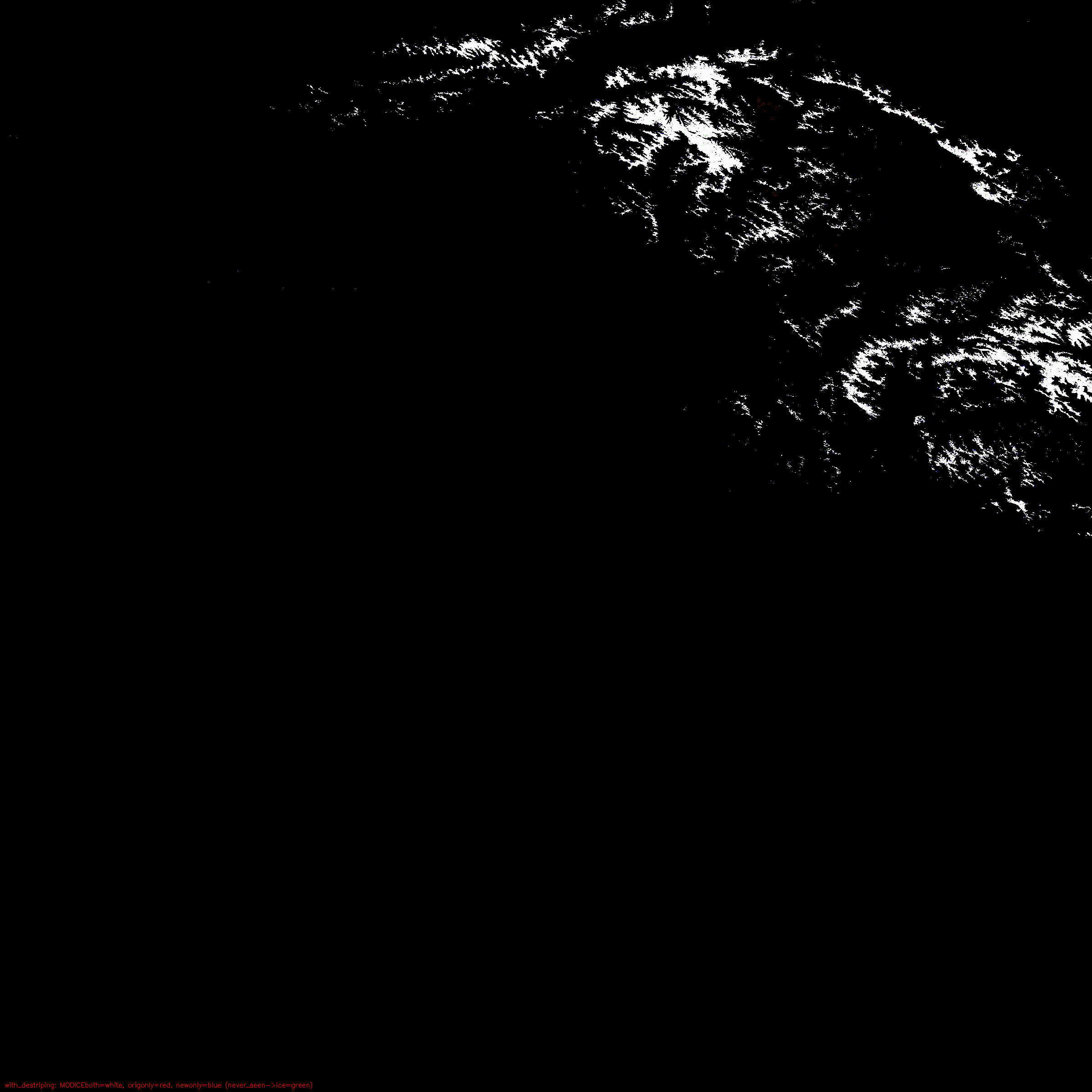 I'm surprised that there isn't more green in the original MOD10A1 vs latest fixes MOD09GA. But maybe Tom isn't? Remember that this is MODICE, so it's a cumulative effect of differences over the 90 days. I think the bug fix and destriping are more important, at least for this tile.