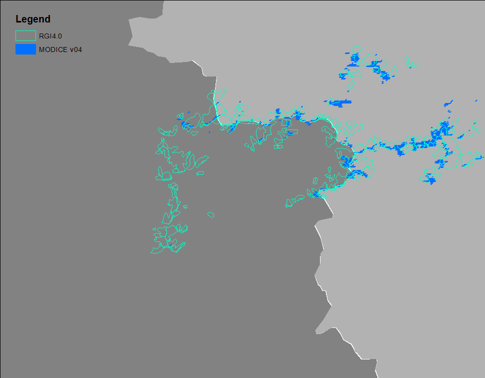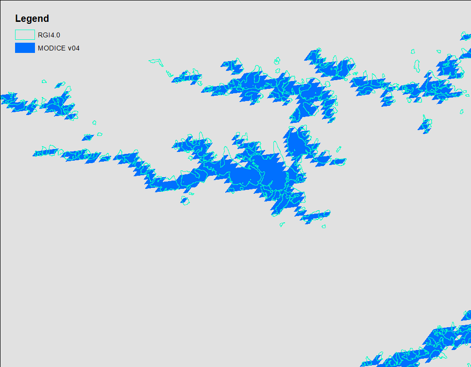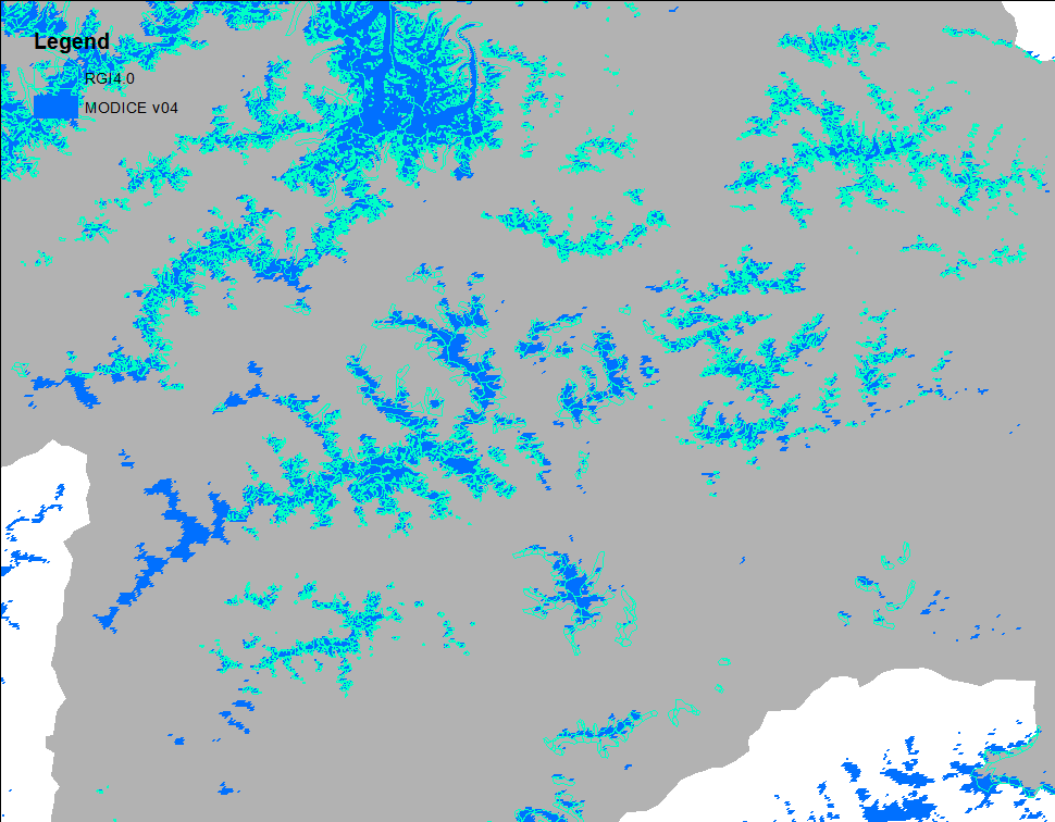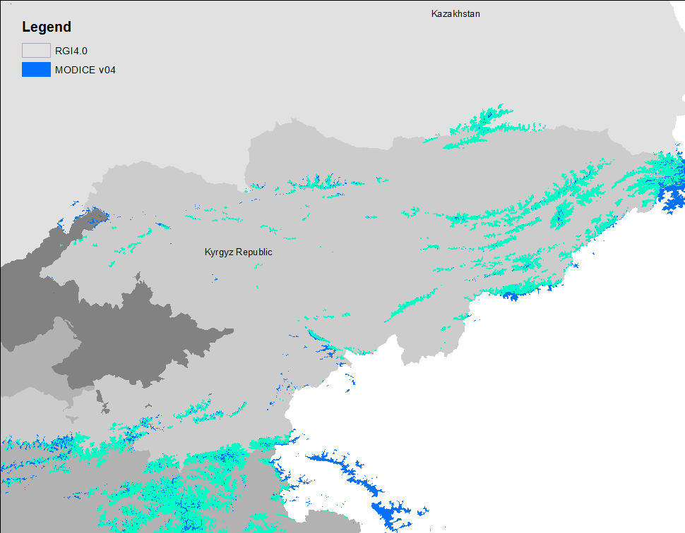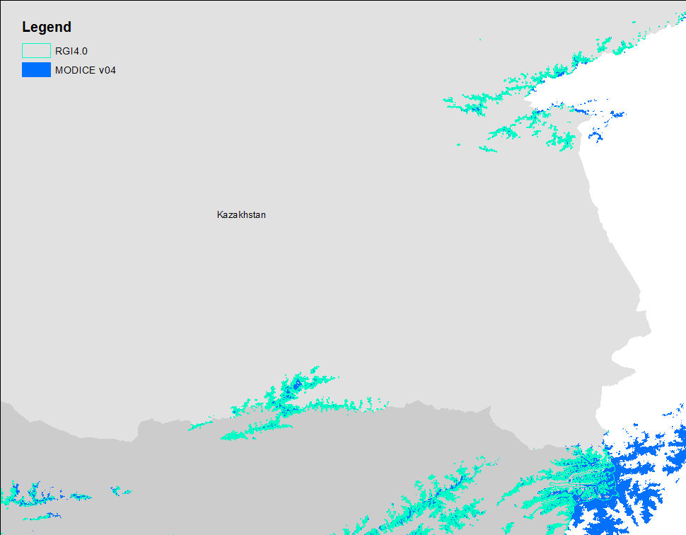 | Zoom: Uzbekistan, MODICE with RGI. Note RGI outlines where MODICE indicates no ice. |