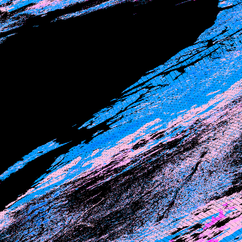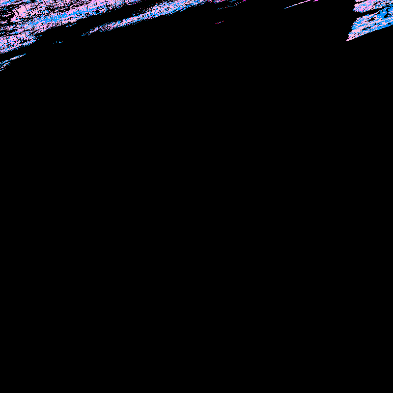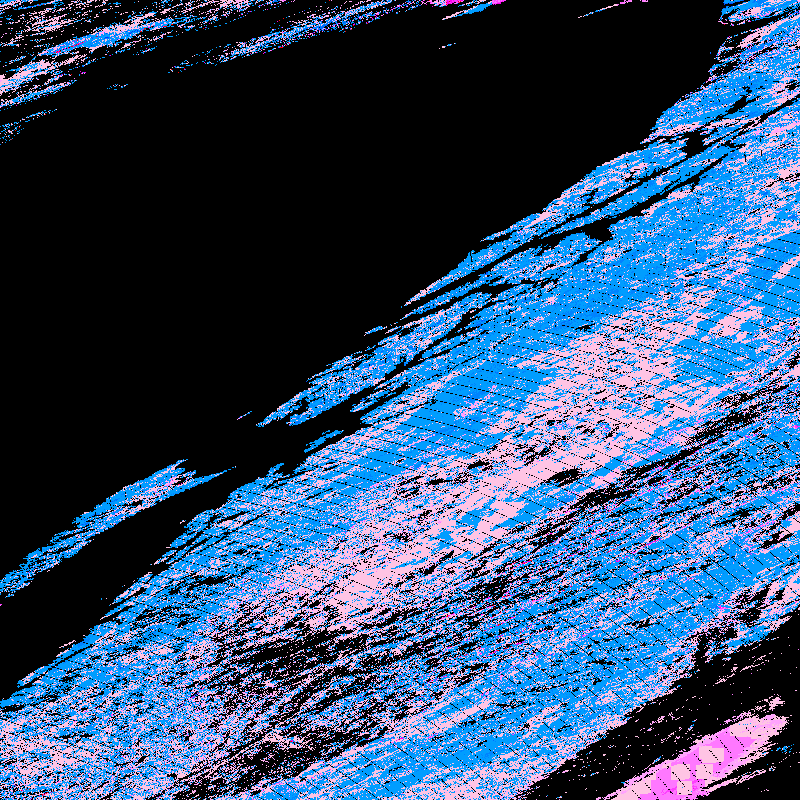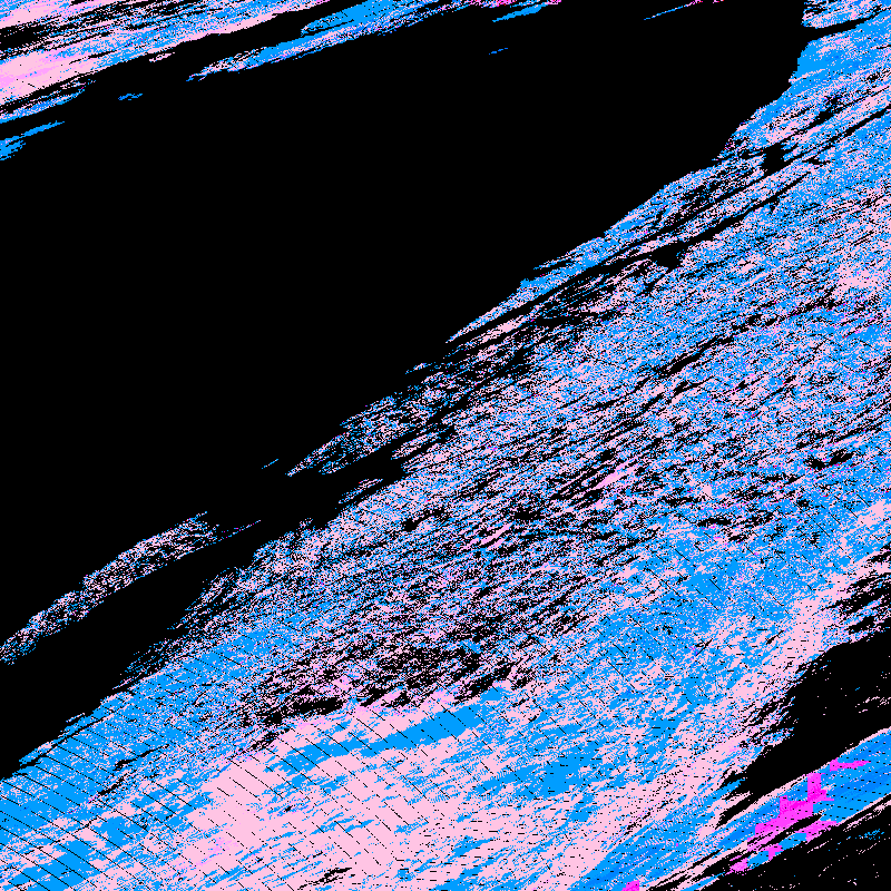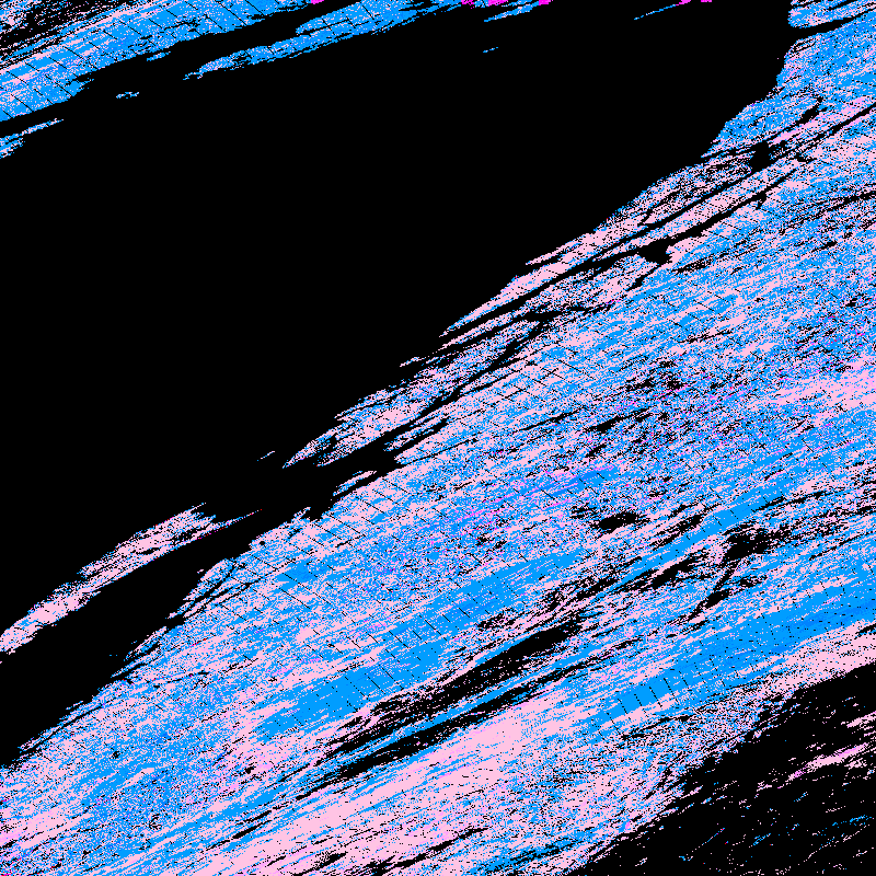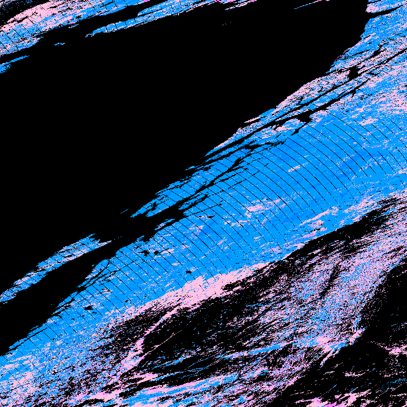 Difference image (anyplace where scag returned -0.01 I mapped to black); difference is scag - MODSCAG, blues are negative, pinks are positive