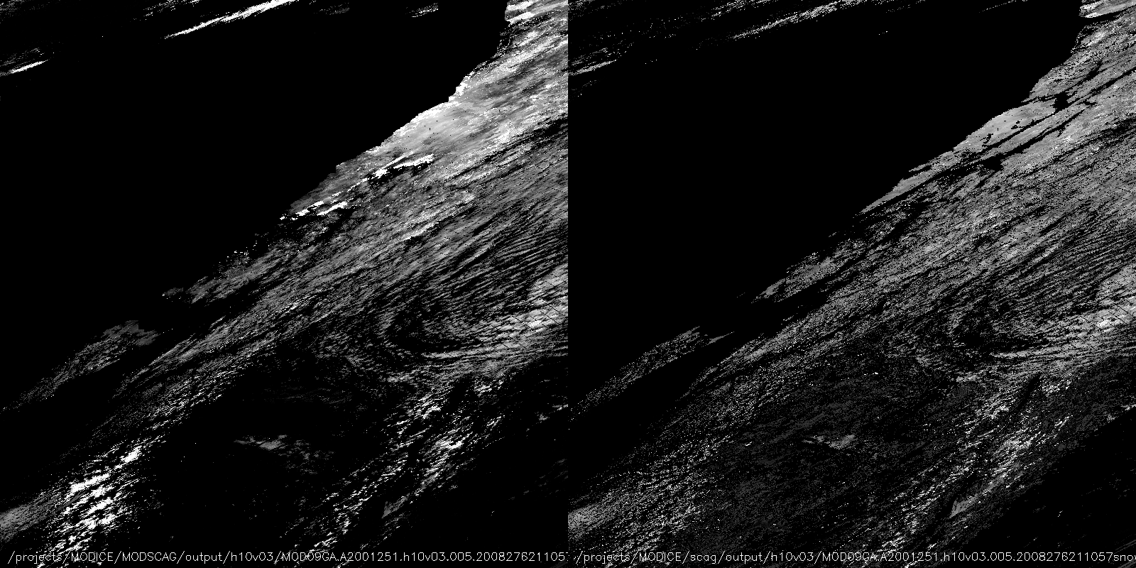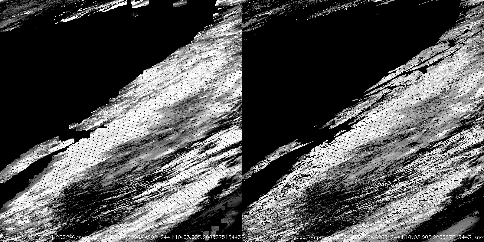 I compared original, NSIDC MODSCAG processing to output from latest version of NOHRSC scag from THP (August 2010) for h10v03 (SE Alaska tile). Each row contains