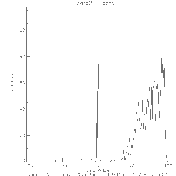 Before/after snow_fraction output for 2001, Sept 2-5, tile h23v04. Left 2 images are before/after bug fix, third image is difference, last is histogram of image differences.