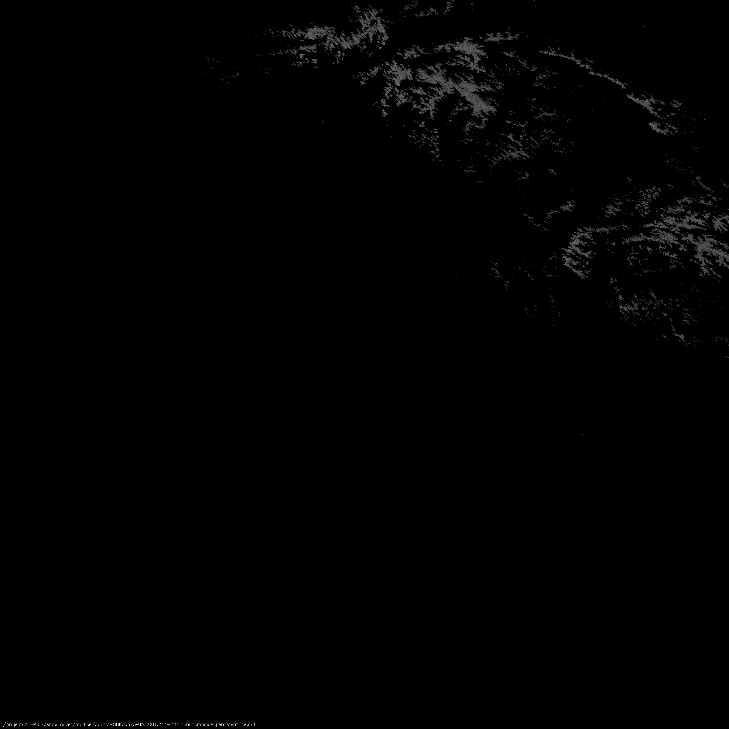 MODICE for tile h23v04, all of 2001 (244-344), before/after bug fix. "Before" data were produced in Oct 2010, so they would also have suffered from the non-snow memory map resolution issue. I think the "after" images *look* a lot less noisy and more realistic. Data values 0-100 snow fraction and 255 for "permanent ice from 'other' category with adequate signal" are displayed with no scaling into linear black-white color table from 0-255.