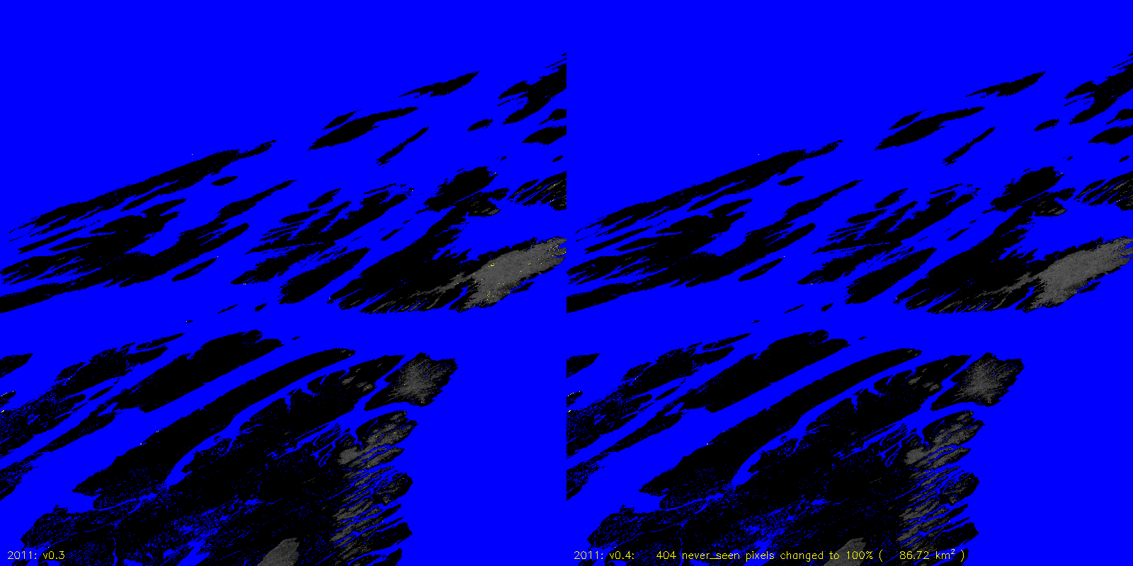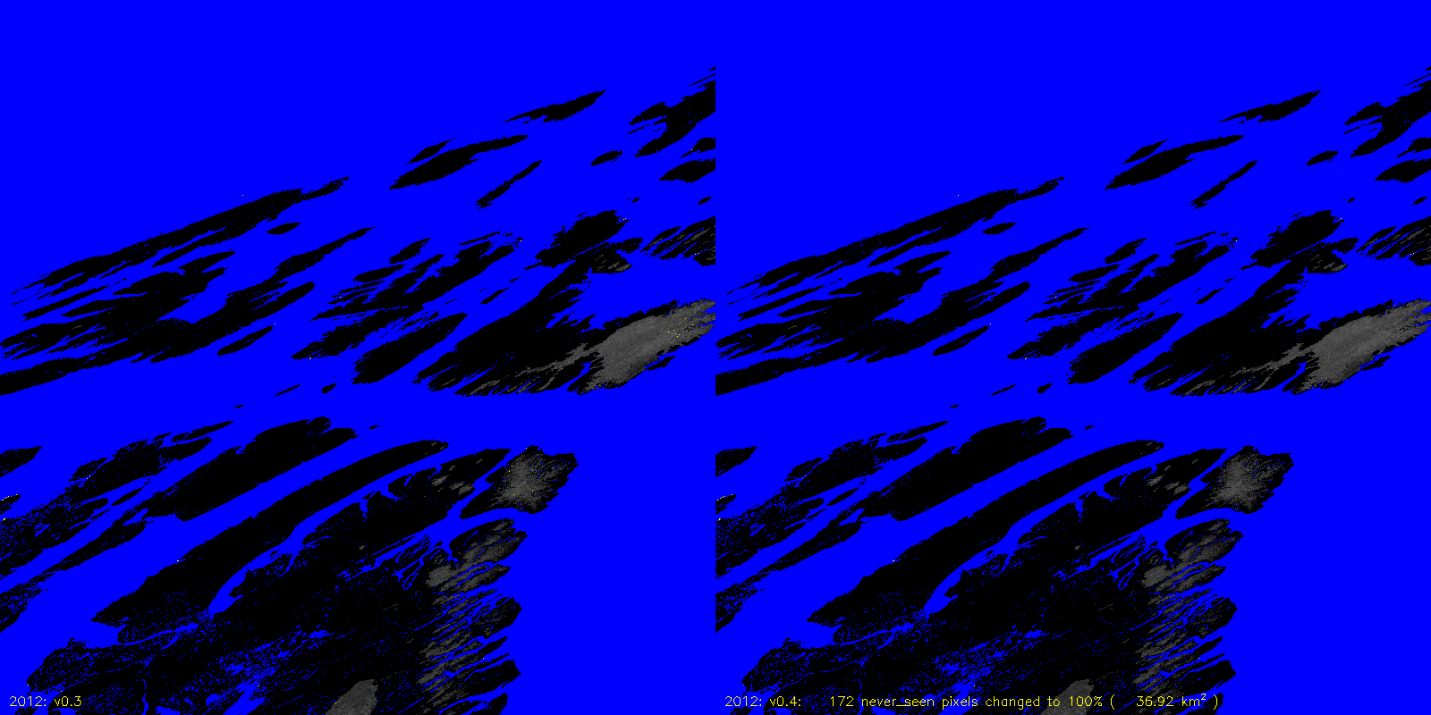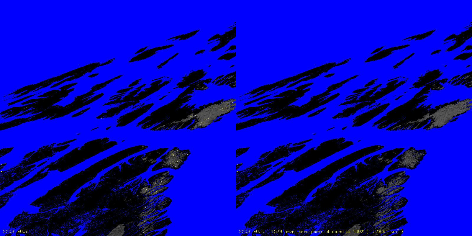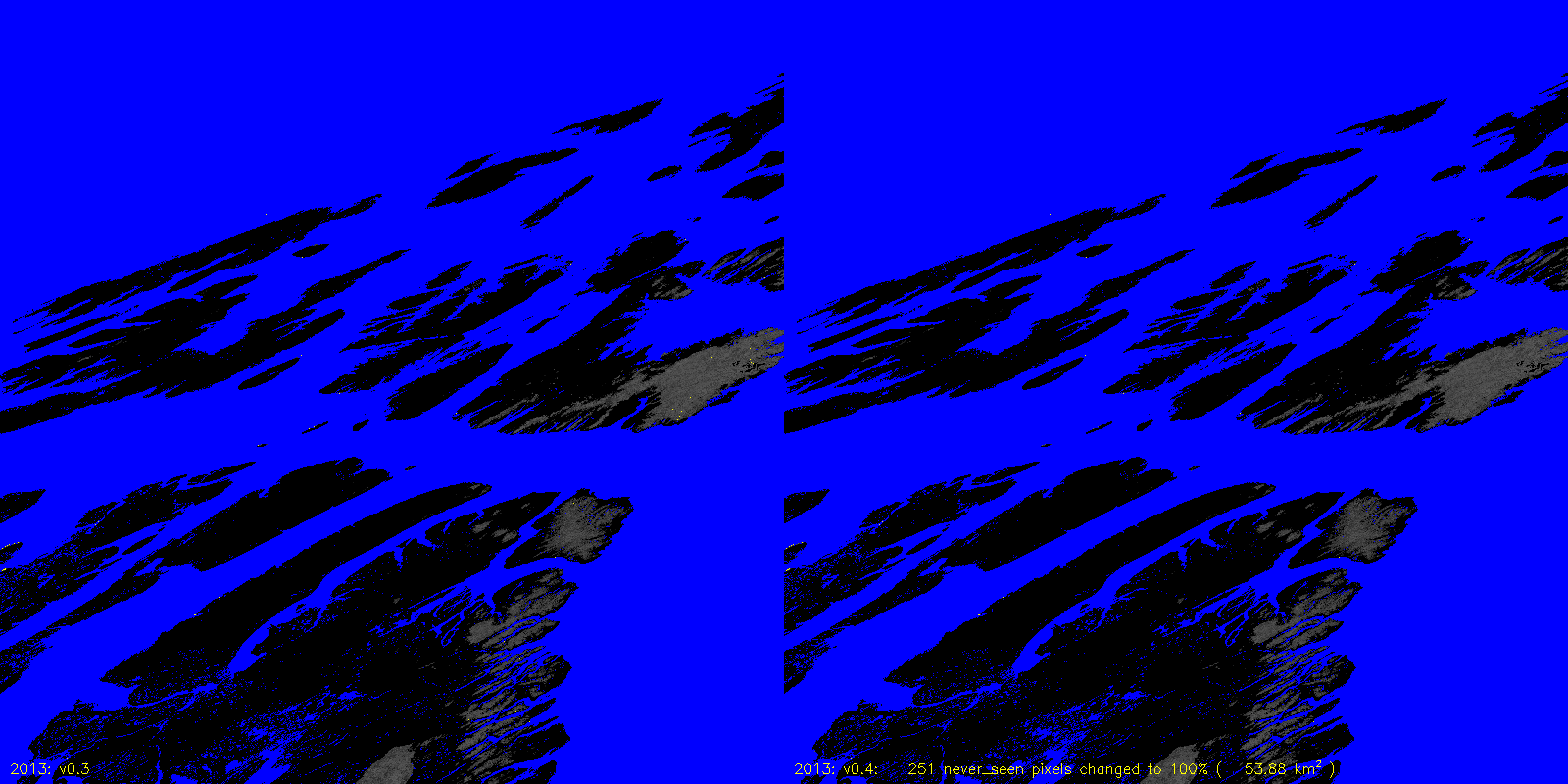 MODICE.v0.4 corrects a bug in v0.3 (and prior) processing that was setting pixels that were always 100% scag snow fraction to never_seen. The following are v0.3 to v0.4 differences, including the number of pixels (and area) that are changed.