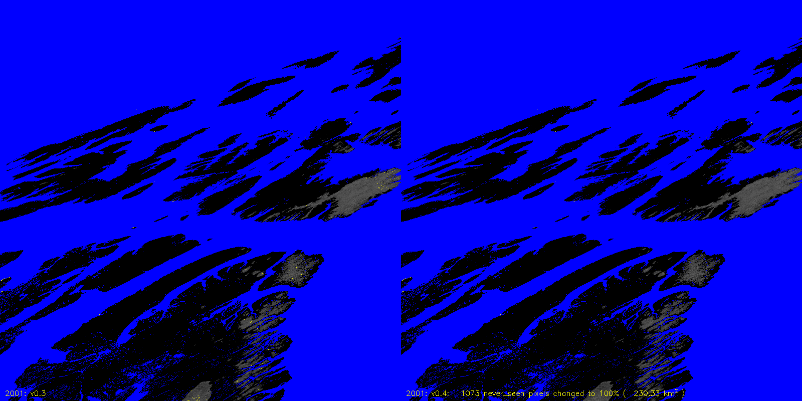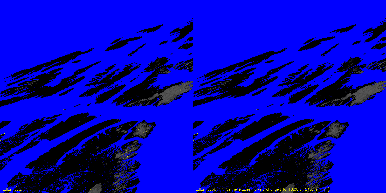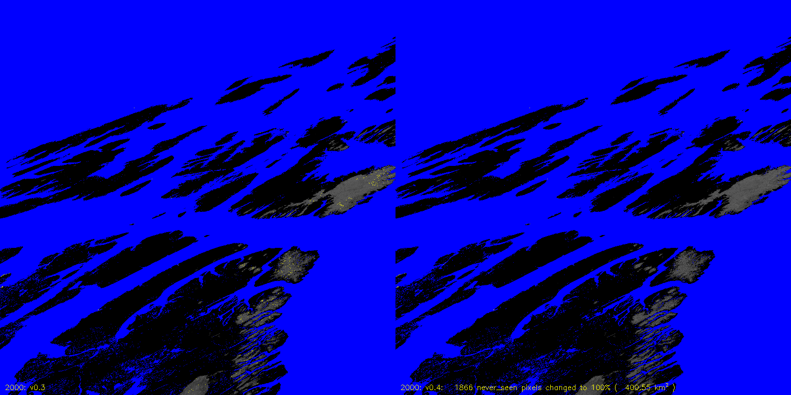 MODICE.v0.4 corrects a bug in v0.3 (and prior) processing that was setting pixels that were always 100% scag snow fraction to never_seen. The following are v0.3 to v0.4 differences, including the number of pixels (and area) that are changed.