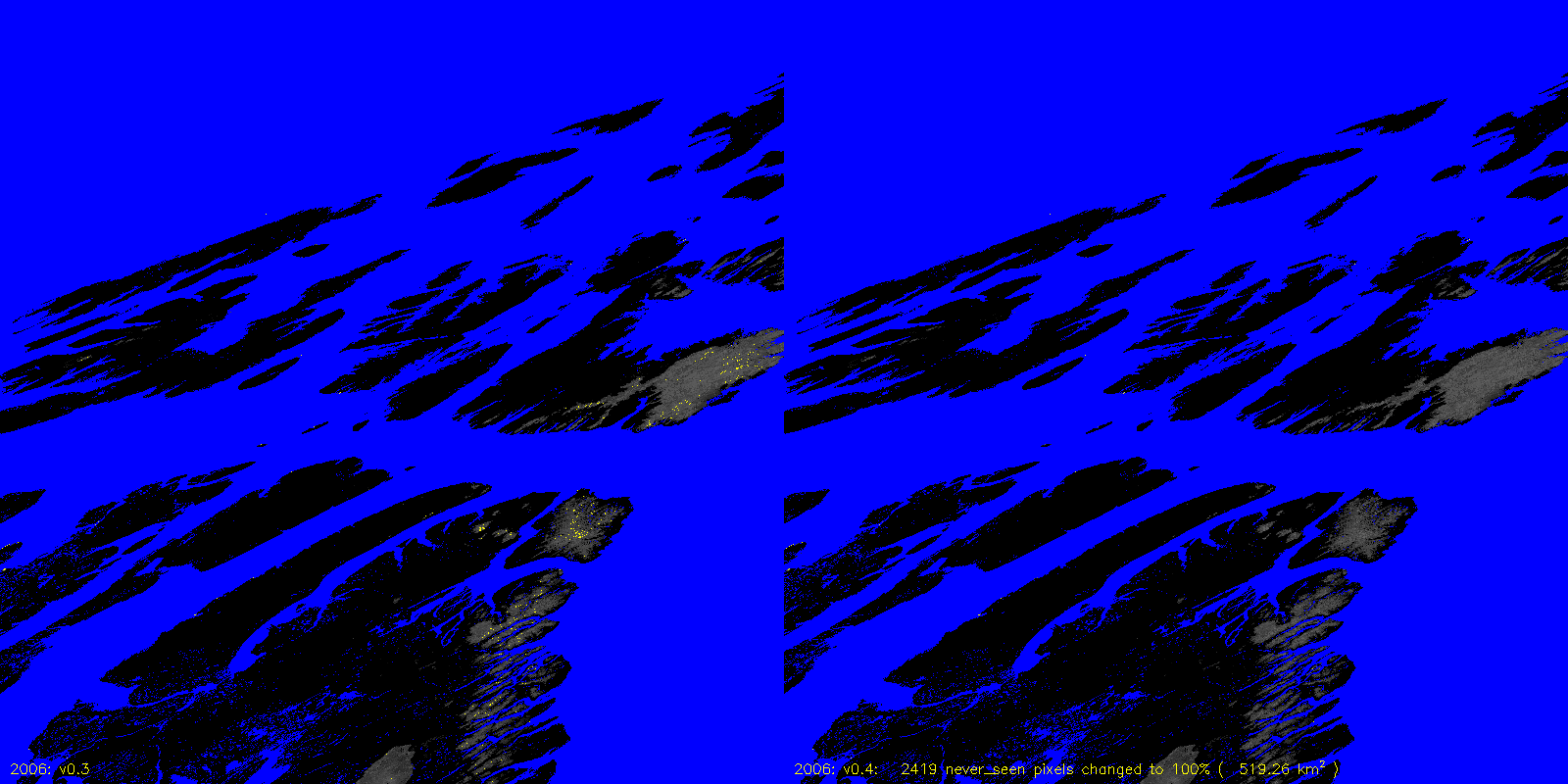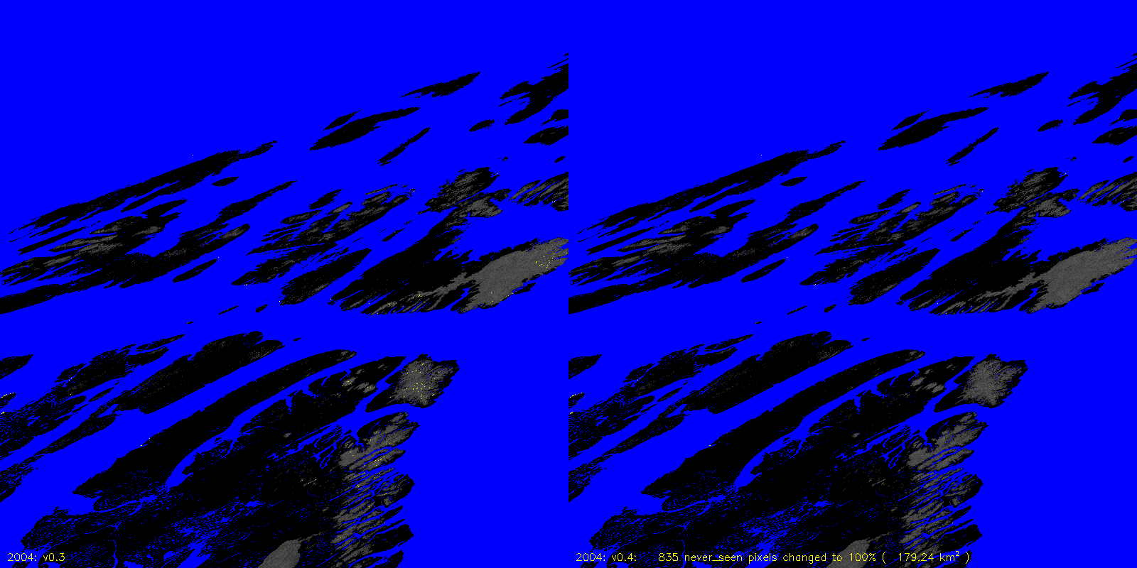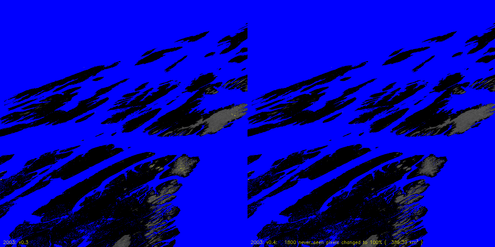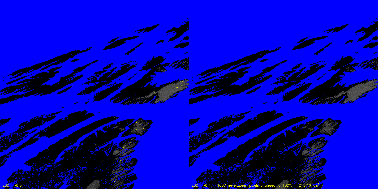 MODICE.v0.4 corrects a bug in v0.3 (and prior) processing that was setting pixels that were always 100% scag snow fraction to never_seen. The following are v0.3 to v0.4 differences, including the number of pixels (and area) that are changed.