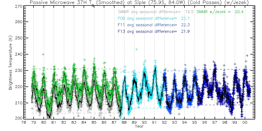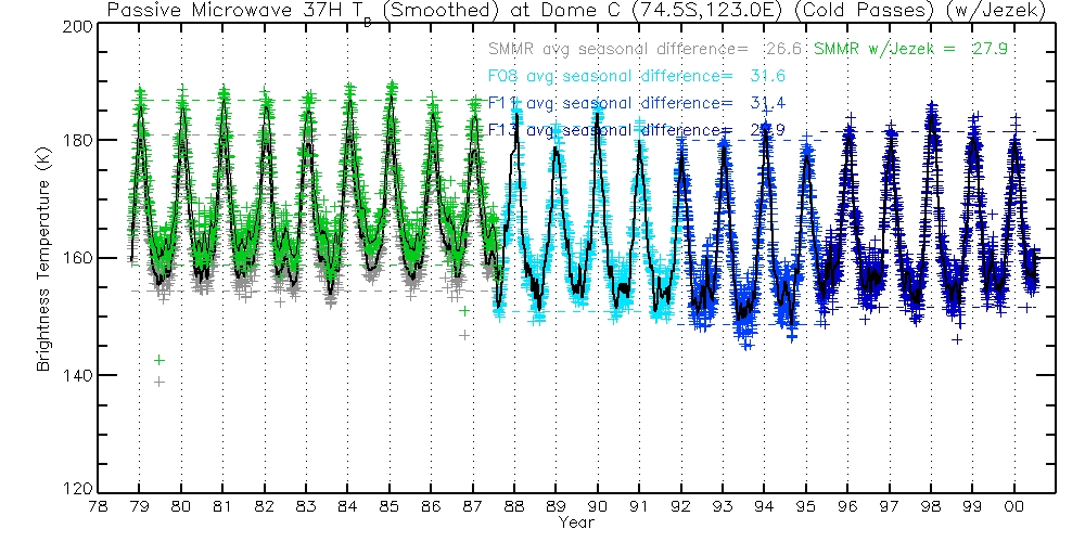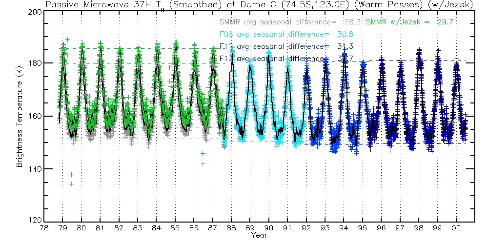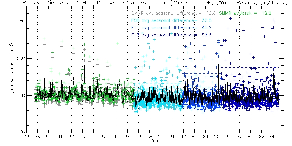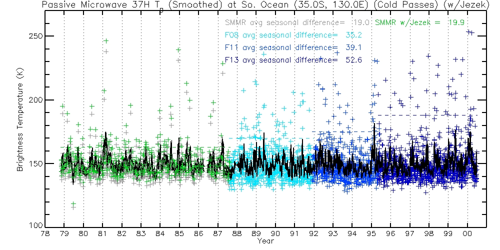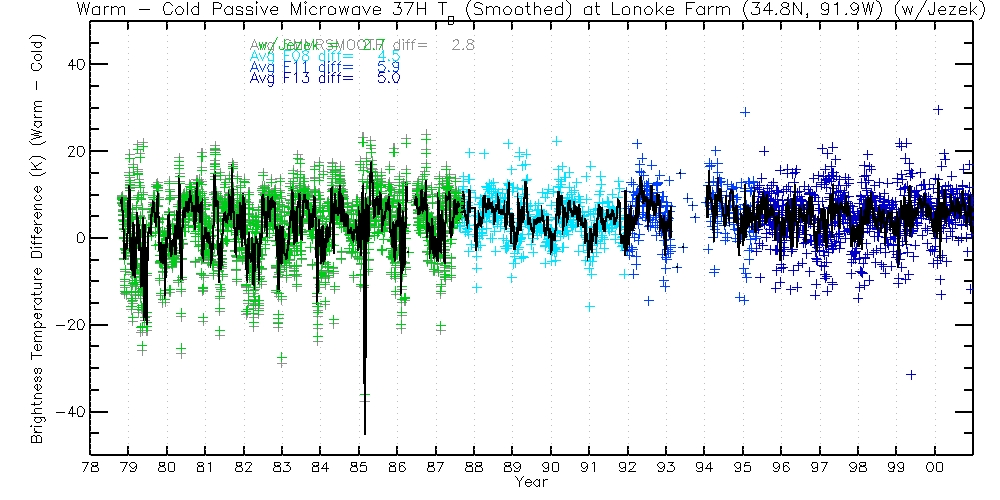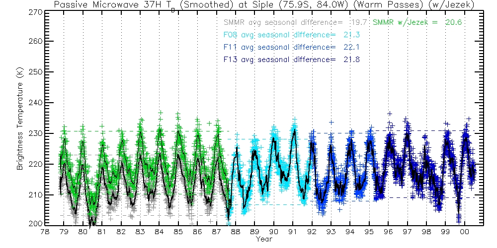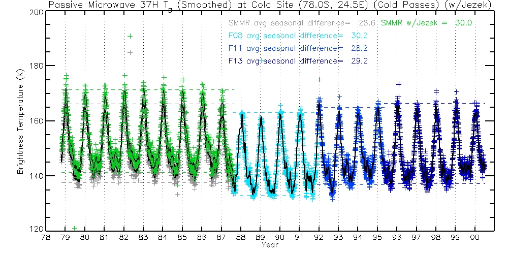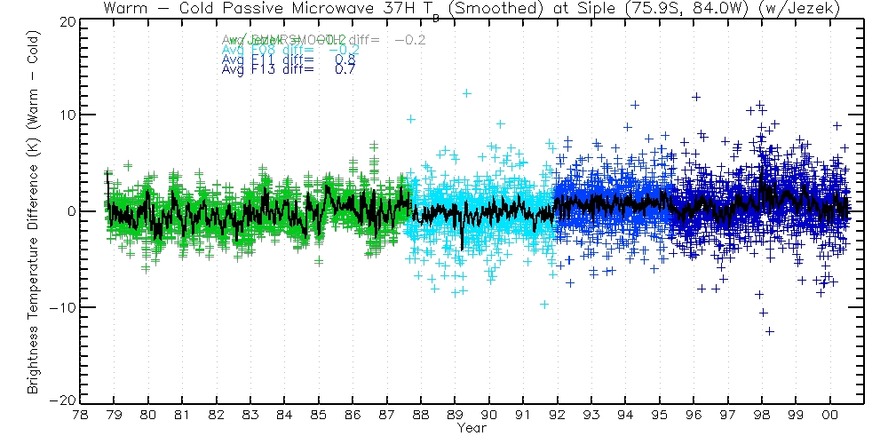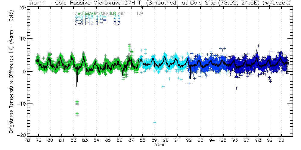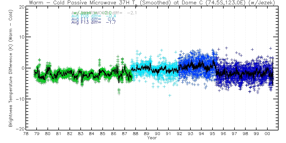 The following table contains 37H TBs, before and after Jezek corrections. Columns are Warm Passes, Cold Passes, and differences (Warm-Cold).