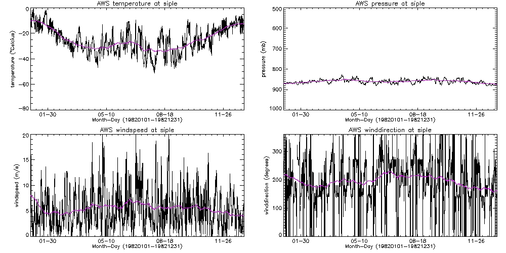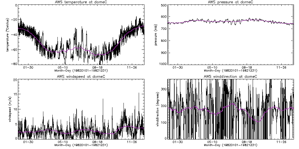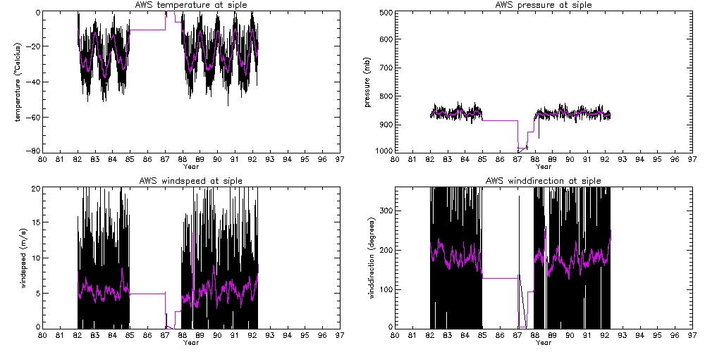 Solid black line is 30-day smoothed AWS temperatures. Note that y-axes are scaled differently at Siple and Dome C. |